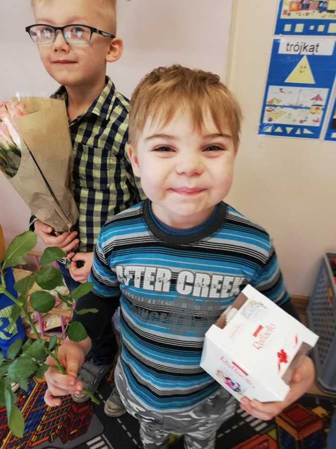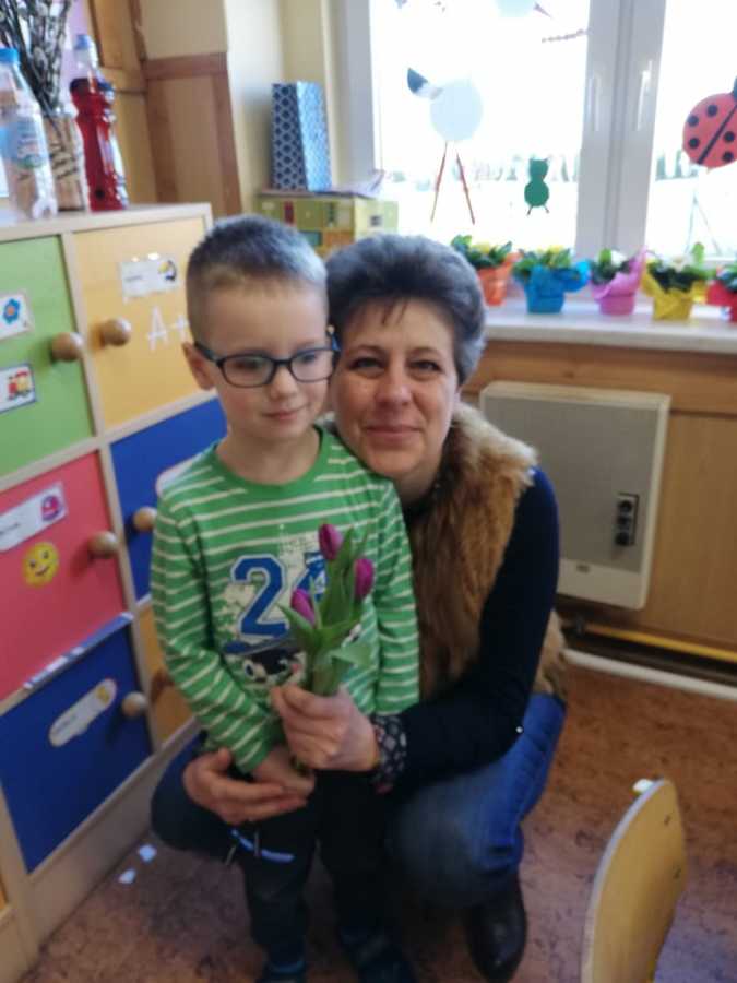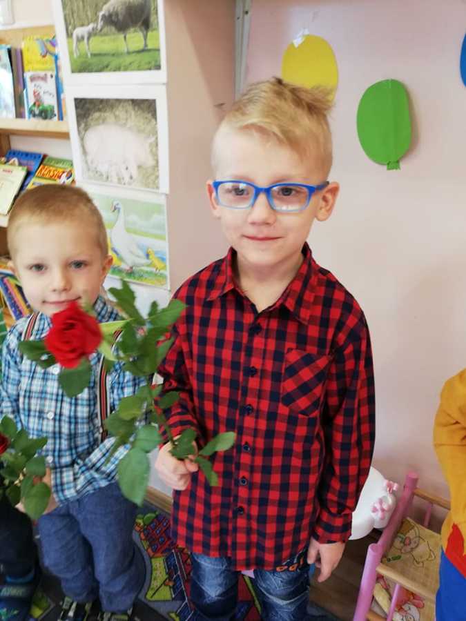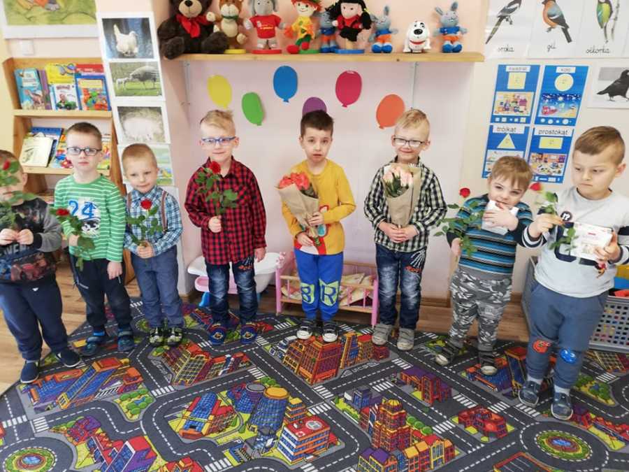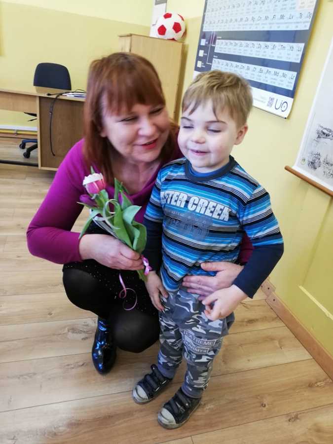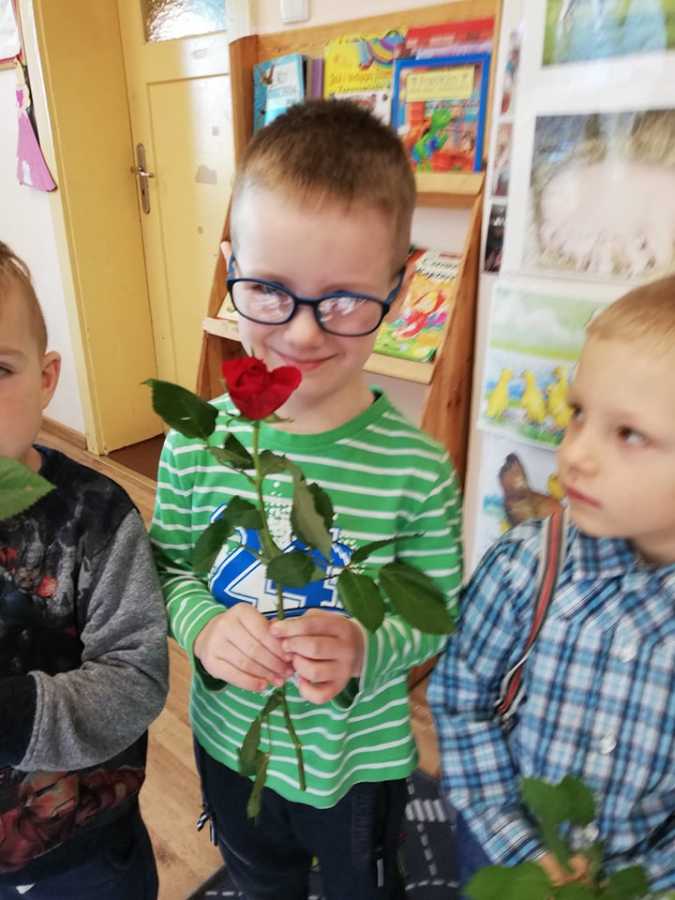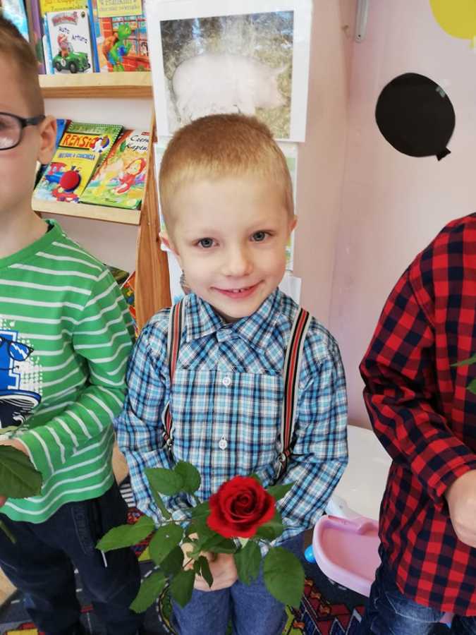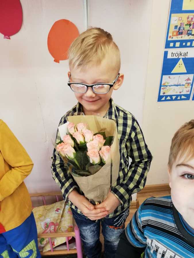 życzenia dziewczynkom i paniom. Nie obyło się bez kwiatka, słodkiego upominku. Z dziewczęcych buź uśmiech nie schodził