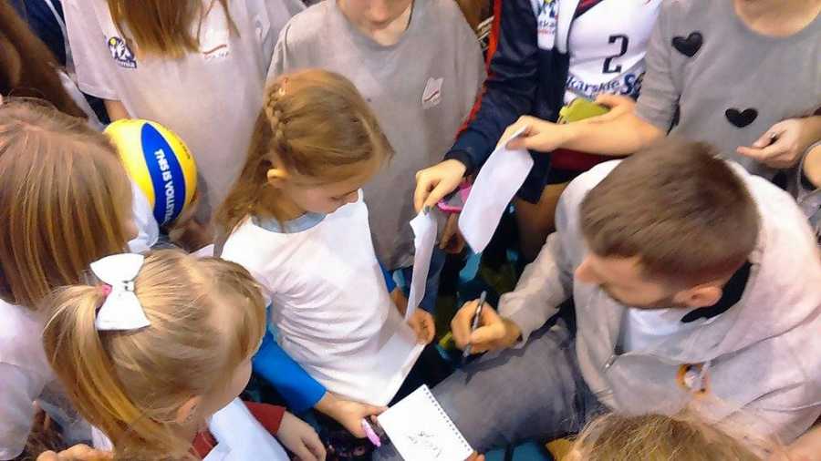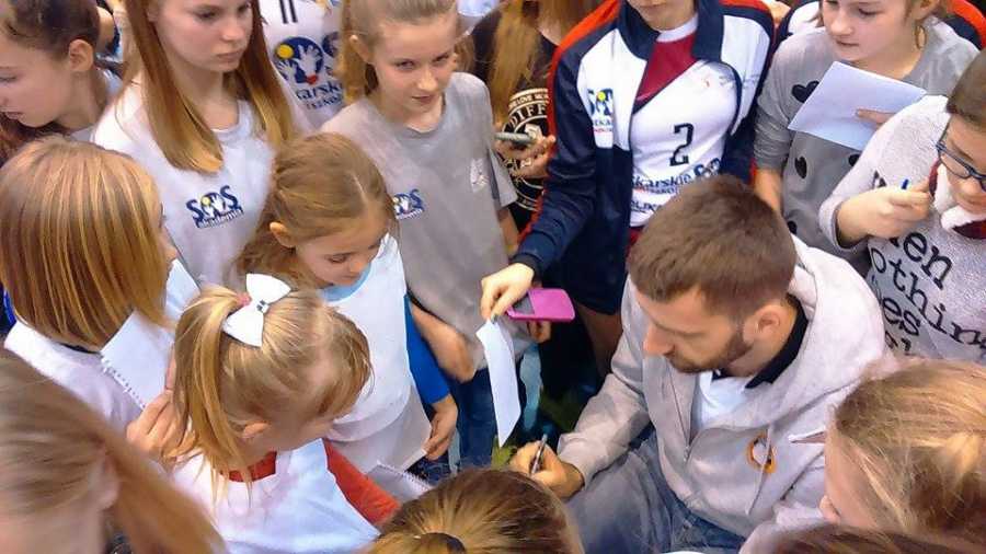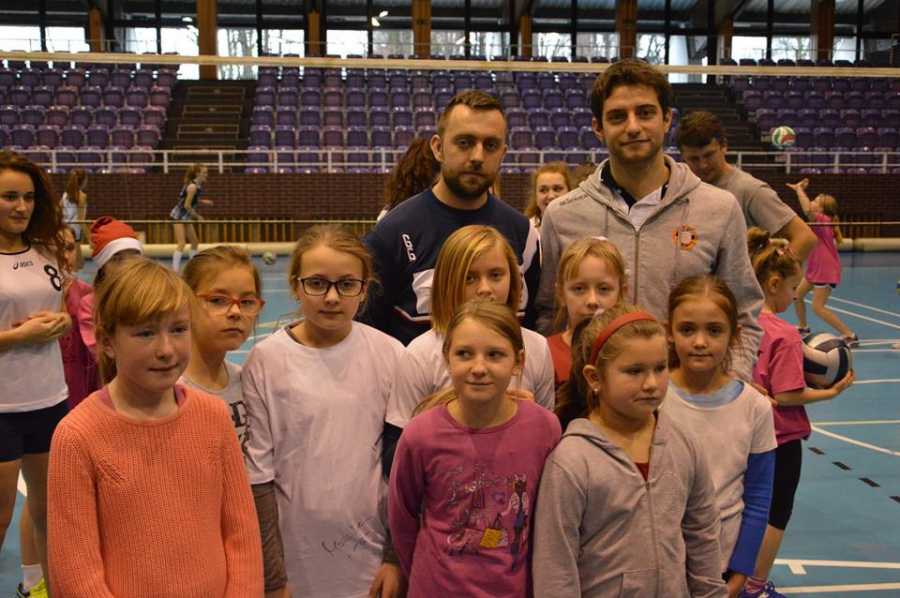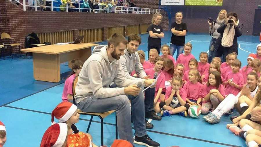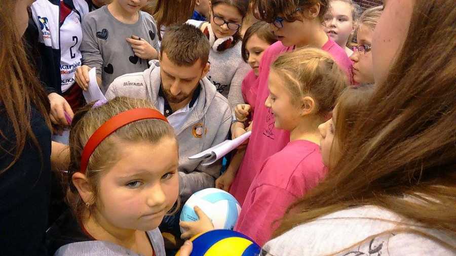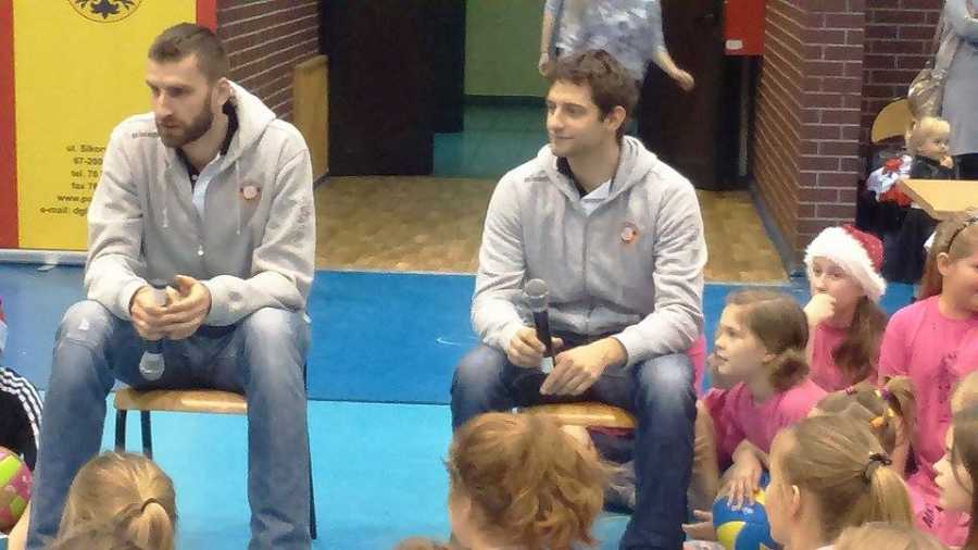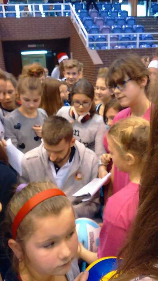 Dnia 7 grudnia dziewczynki uczęszczające na zajęcia Skolnego Koła Siatkarskeigo udały się do Głogowa na spotkanie z reprezentantami Polski w piłce siatkowej Marcinem Możdżonkiem i Grzegorzem Łomaczem. Nasze małe siatkarki,miały okazję stanąć oko w oko z mierzącym 212 cm środkowym bloku Cuprum Lubin, zrobić z mistrzem pamiątkowe zdjęcie oraz uzyskać autograf na koszulce. Dodatkową atrakcją tego dnia była możliwość obejrzenia meczu siatkarek MKS-u Piast Głogów.