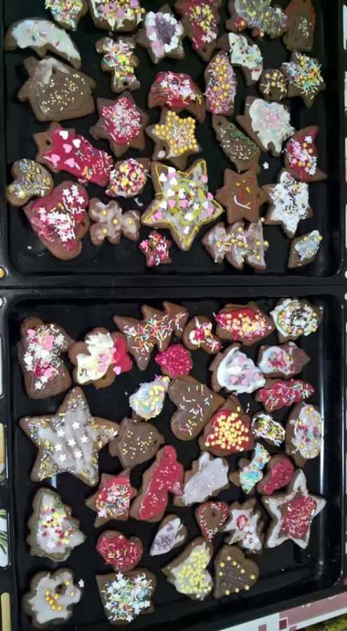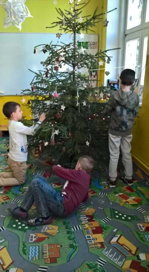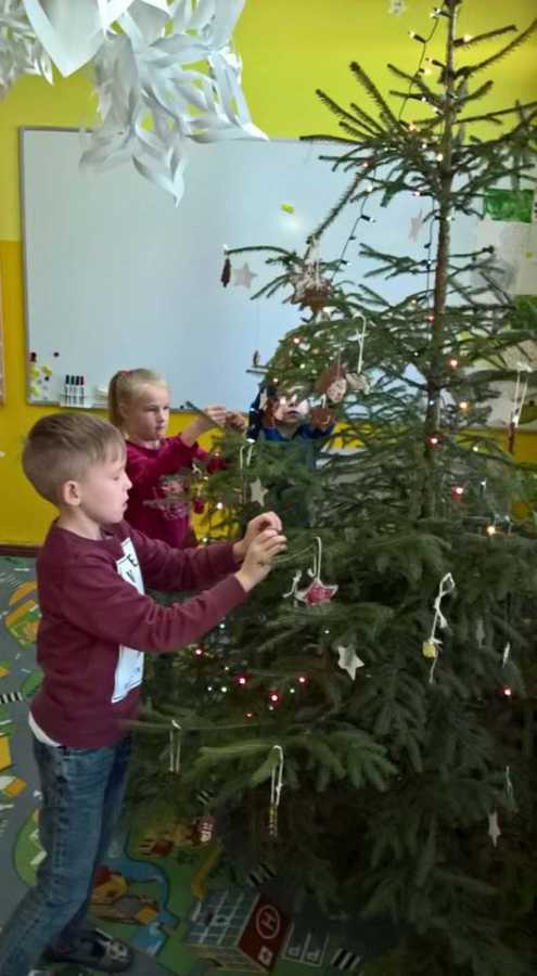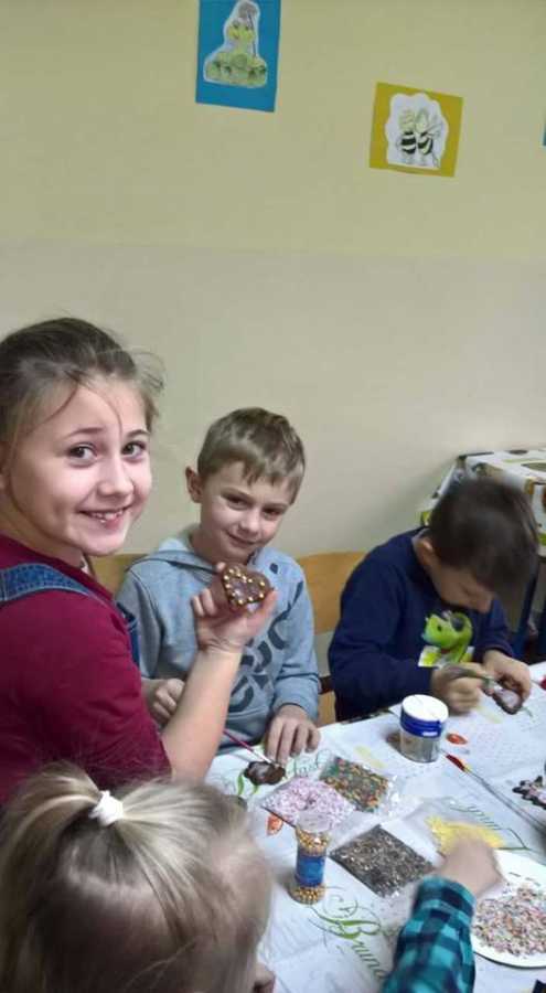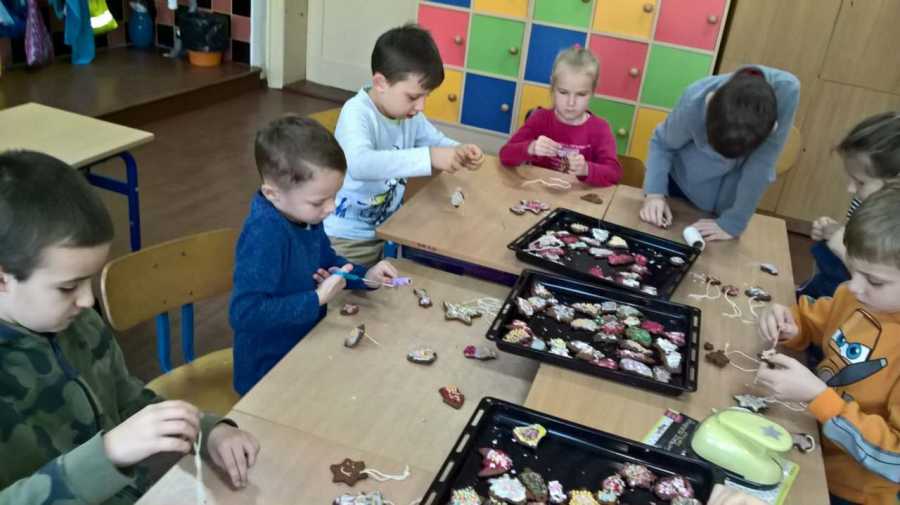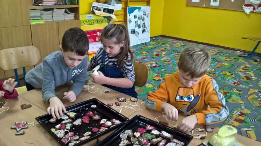 Podczas zajęć z wychowawca Panią Iloną dzieci dowiedziały się jakie składniki są potrzebne do wykonania pierników, a następnie w jaki sposób wykonać ciasto. Gdy już wszystko zostało wyjaśnione uczniowie z entuzjazmem przystąpili do pracy. Gotowe rękodzieła zwisły na żywej klasowej choince.