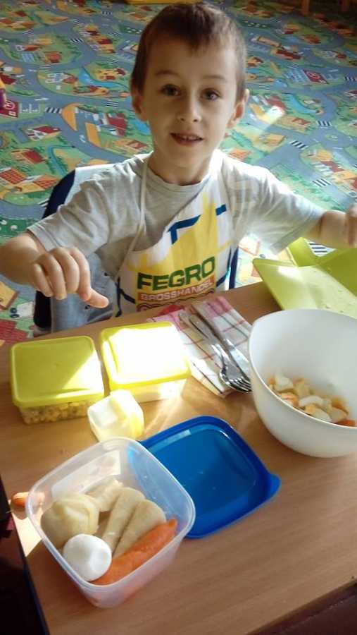 Nasza szkoła bierze udział w projekcie edukacyjnym Zdrowo jem, więcej wiem! Honorowy patronat Małżonki Prezydenta RP Agaty Kornhauser-Dudy W ramach projektu, uczniowie naszej szkoły podjęli działania promujące zdrowie. Wykorzystaliśmy różnorodne pomysły. Pierwszym z nich było zorganizowanie dnia Kolorowa jesień. Podczas obchodów, tego dnia każda klasa była zaangażowana w akcję. Uczniowie byli zobowiązani do stworzenia plakatów, do zrobienia dekoracji na drzwi, projektowali kukiełkę-Jesień. Sfinalizowaniem tego dnia był apel, na którym to uczniowie prezentowali wiersze, piosenki, spektakle na temat tego, jakie zdrowe produkty przynosi nam jesień. Kolejnym działaniem było stworzenie osobnej gazetki dla dzieci i rodziców. Na gazetce umieszczono hasło promujące zdrowie i całą akcję, oraz ciekawe informacje dla rodziców. W ramach akcji dzieci z klasy 0- I przynosiły do szkoły owoce i warzywa, które wkładały do wspólnego kosza. Następnie po drugim śniadaniu, konsumowaliśmy przyniesione produkty. Zrobiliśmy również sok z przyniesionych darów oraz sałatkę warzywną, którą konsumowali również rodzice. Dzieci uczestniczą w lekcjach z zakresu zdrowego żywienia oraz biorą udział w proponowanych konkursach. Najbliższy konkurs polega na stworzeniu WODOLUBKA-postaci, która promuje picie wody, zamiast sięgania po napoje słodzone.
